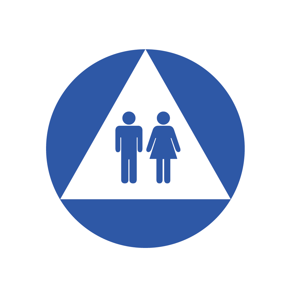 These 12" round restroom signs are made from acrylic and mounted using double-stick adhesive. The logo and copy are white on a blue background.